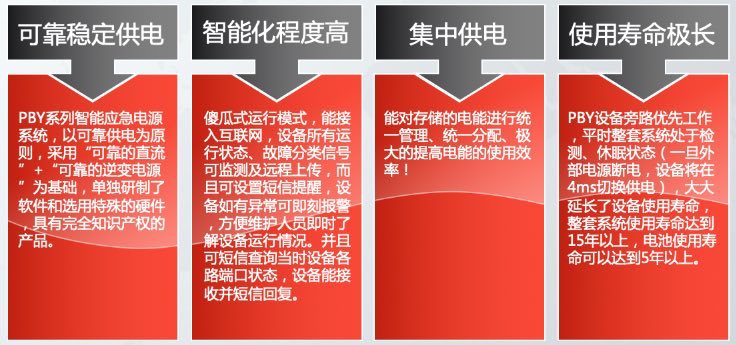 PBY智能應急電源系統,是我公司本著可靠供電為原則,采用“可靠的直流”+“可靠的逆變電源”的方案,單獨研制了軟件和選用相關的硬件,具有完全知識產權的產品。它集中了直流電源柜(屏)、UPS、EPS的許多優點,提高了電源的可靠性和實用性.